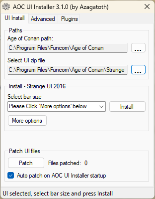 3. Select UI Zip File - Click on the ... and click on the Strange UI Zip file C:\Program Files\Funcom\Age of Conan/Strange UI (20190328) latest.zip